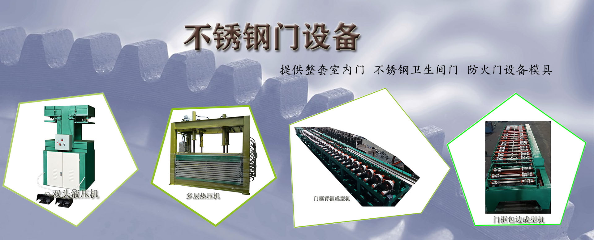 液壓鎖孔機、四柱壓花機、全自動液壓熱壓機(即門扇整平機)、門框45度切角機、45度切角模具、門花壓花模、沉鉸模、商標模等,也可定做房間門,防火門,衛生間門整套自動化生產線,同時可以定制非標沖壓自動化整套解決方案。